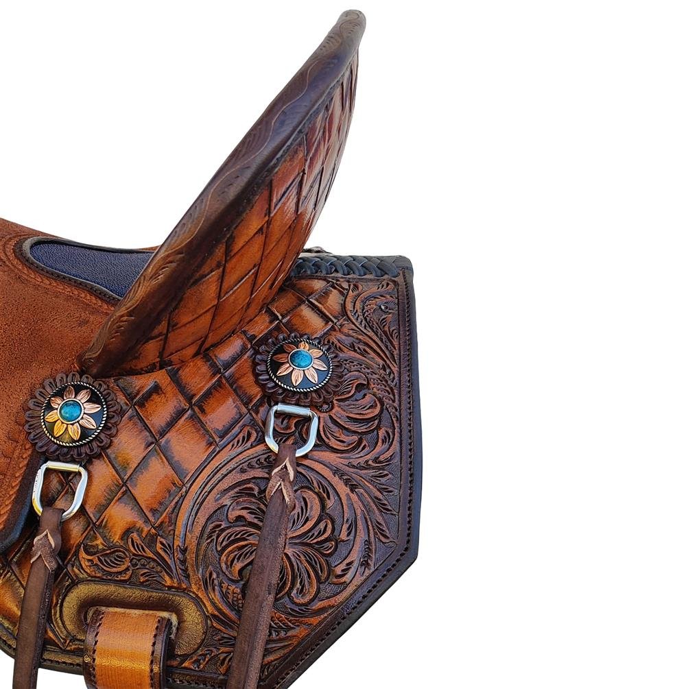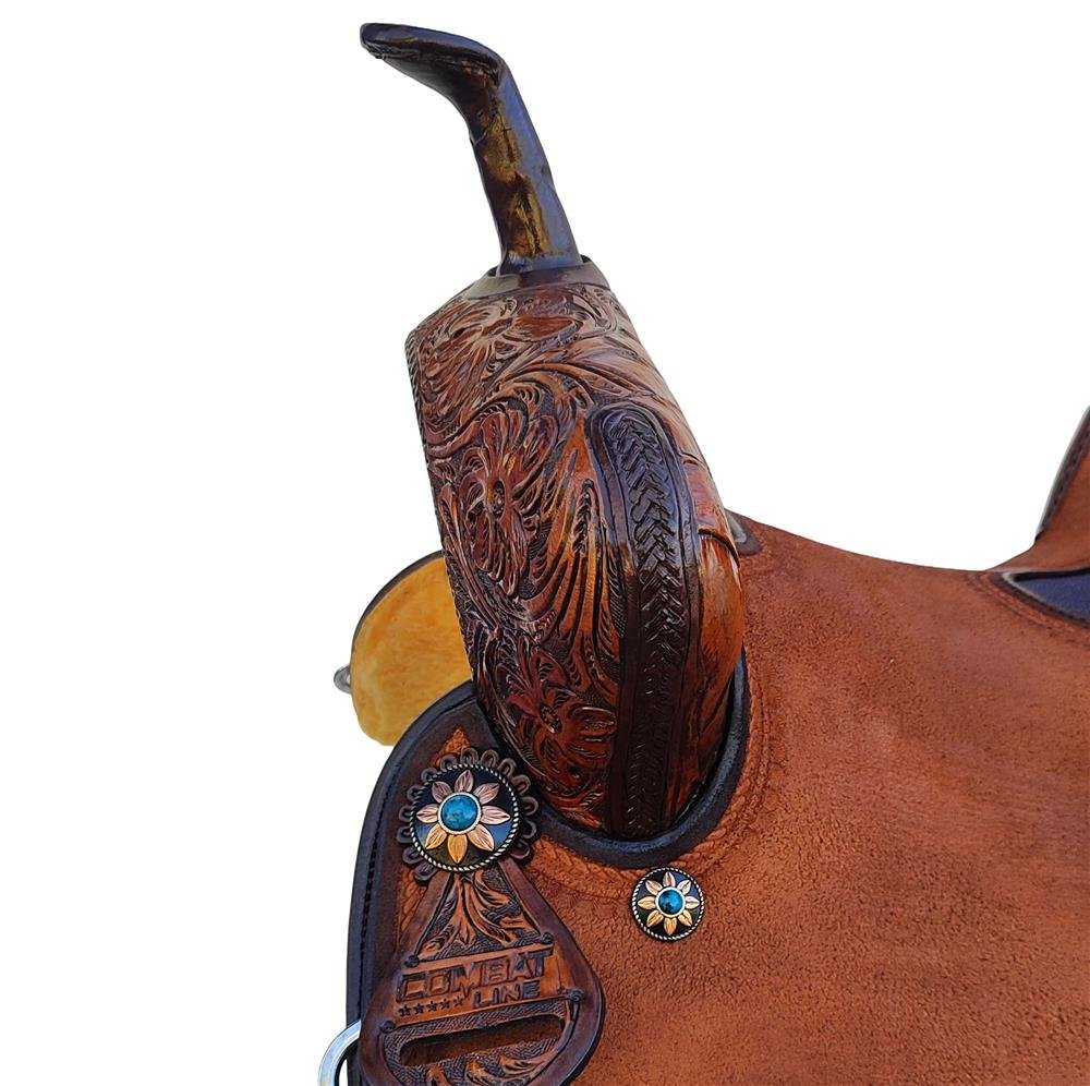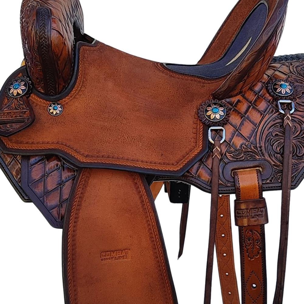 Fabricada à mão com couro de boi curtido no quebrach padrão exportação, possui armação inervada que garante resistência e durabilidade. Seu acabamento é enriquecido com bordado Flor e verão de trança, ferragens em inox e loros inteiriço para máxima segurança.